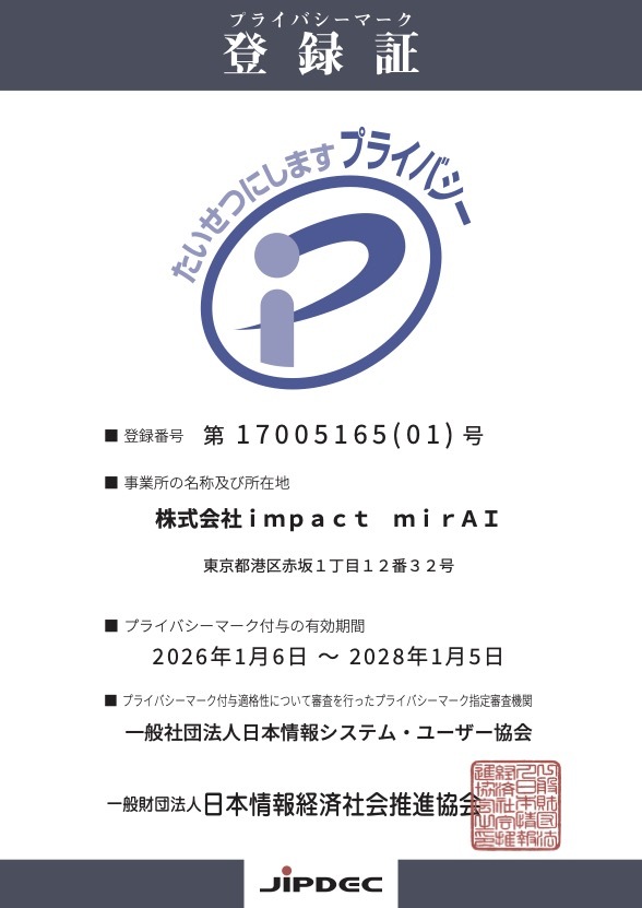 当社の個人情報保護マネジメントシステムは、2026年1月に一般財団法人 日本情報経済社会推進協会(JIPDEC)のプライバシーマーク認定を取得しました。