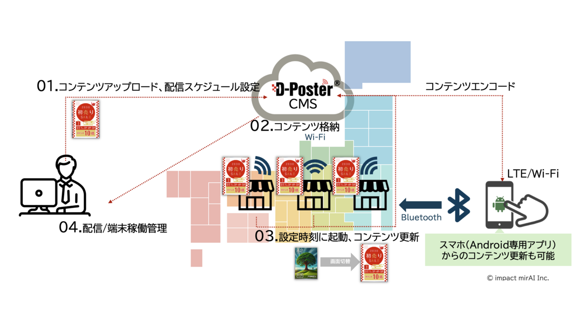 遠隔からはPC、店舗現場からはスマホを使用して、コンテンツ更新、配信管理を行うことが可能